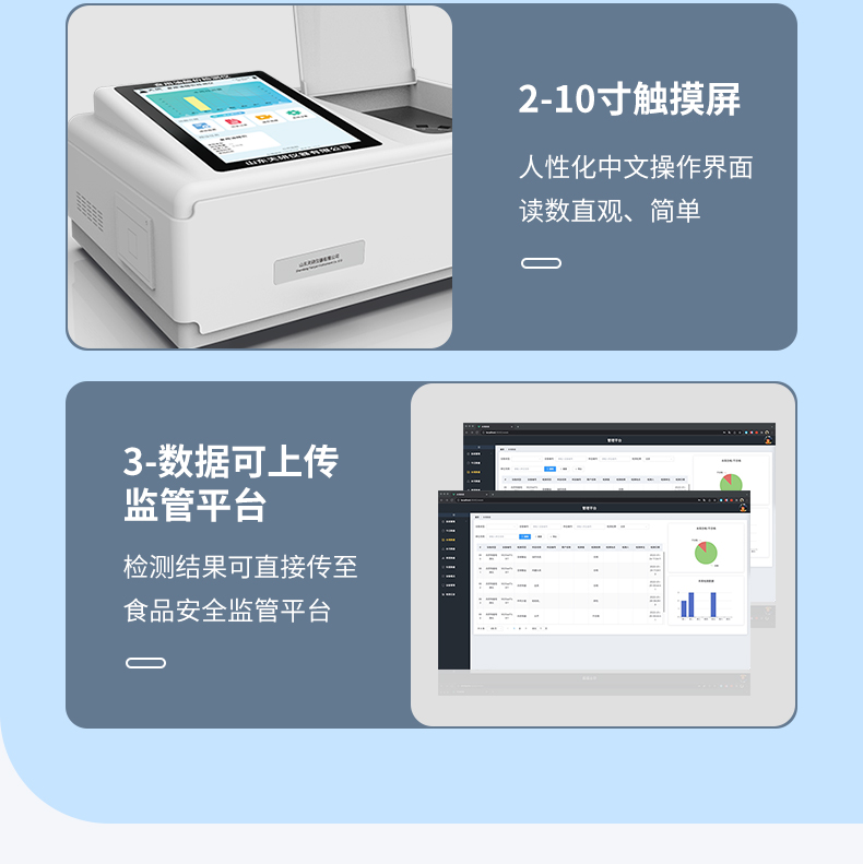 | 儀器采用臺(tái)式一體化系統(tǒng)檢測(cè)技術(shù),將分光光度模塊、新型農(nóng)殘檢測(cè)模塊、數(shù)字化管理模塊、無線通訊模塊高度集成于一體,支持檢測(cè)200種食品安全檢測(cè)項(xiàng)目,同時(shí)預(yù)留升級(jí)檢測(cè)方法。 | 儀器檢測(cè)模塊標(biāo)準(zhǔn)化、智能化,可隨意自由組合。檢測(cè)箱體內(nèi)置多個(gè)標(biāo)準(zhǔn)檢測(cè)單元,檢測(cè)模塊可以調(diào)整配置。 | 儀器采用全新安卓智能系統(tǒng),主控芯片采用 ARM Cortex-A7,RK3288/4核處理器,10.1寸高清液晶觸摸豎屏,更加**的UI交互界面,運(yùn)轉(zhuǎn)快捷;儀器配備無線通信模塊: 4G(APN)通訊模塊、Wifi模塊,藍(lán)牙傳輸,同時(shí)具有雙USB接口以及RJ45接口能以多種方式實(shí)現(xiàn)數(shù)據(jù)保存和數(shù)據(jù)傳輸功能。 | 創(chuàng)新檢測(cè)模式: | ★檢測(cè)通道:≥12通道;采用精密旋轉(zhuǎn)比色池設(shè)計(jì),使用同芯片同光源校準(zhǔn)精度,解決不同光源之間的誤差值。1-12通道間誤差0.1%。(**號(hào):ZL202022821055.2) | ★儀器具有自動(dòng)識(shí)別比色皿檢測(cè)功能,即:將樣品比色皿放入儀器后,點(diǎn)擊樣品檢測(cè),儀器自動(dòng)識(shí)別比色皿進(jìn)行通道檢測(cè)。 | 進(jìn)口高精光源: | 高精度進(jìn)口四波長(zhǎng)冷光源,通道配置 410、520、590、630nm 波長(zhǎng)光源,一個(gè)光源芯片驅(qū)動(dòng)一個(gè)光源,誤差極小,每臺(tái)設(shè)備單獨(dú)**校準(zhǔn)光源,**比對(duì),同時(shí)參照四種不同波段光源全方位覆蓋市面上99%的農(nóng)殘食品項(xiàng)目檢測(cè)。 | 智能化操作系統(tǒng): | 便捷操作系統(tǒng):設(shè)備檢測(cè)時(shí)可在同一檢測(cè)界面自動(dòng)對(duì)應(yīng)相關(guān)檢測(cè)通道一次性選擇1-12個(gè)樣品名稱,無須退出界面,節(jié)省操作時(shí)間。 | 數(shù)據(jù)集成系統(tǒng):設(shè)備首頁自動(dòng)統(tǒng)計(jì)檢測(cè)數(shù)據(jù)包含:周檢測(cè)數(shù)據(jù)、月檢測(cè)數(shù)據(jù),全部檢測(cè)總數(shù)量,均包含檢測(cè)總數(shù),合格數(shù),不合格數(shù),以及相關(guān)柱形分析圖,對(duì)各項(xiàng)檢測(cè)數(shù)據(jù)清晰掌握,無需電腦查詢,更加快捷直觀。 | 項(xiàng)目預(yù)設(shè)系統(tǒng):支持添加單個(gè)及多個(gè)相同或不相同的任務(wù)預(yù)設(shè),一鍵快速調(diào)取,每一個(gè)任務(wù)分別可以設(shè)置不同的樣品、批次、編號(hào)、來源、備注、抽樣信息、檢測(cè)信息、受檢信息、復(fù)核信息等更多信息。無縫鏈接平臺(tái)和APP實(shí)時(shí)查看下發(fā)任務(wù)。 | 數(shù)據(jù)監(jiān)管系統(tǒng):同步對(duì)接監(jiān)管平臺(tái),數(shù)據(jù)可局域網(wǎng)和互聯(lián)網(wǎng)數(shù)據(jù)上傳,檢測(cè)結(jié)果可選擇直接傳至食品安全監(jiān)管平臺(tái)。集成OSS輸出存儲(chǔ)服務(wù)、區(qū)分設(shè)備定向管理應(yīng)用,進(jìn)行區(qū)域食品安全監(jiān)管及大數(shù)據(jù)分析處理與數(shù)據(jù)統(tǒng)計(jì),檢測(cè)區(qū)域食品安全長(zhǎng)短期動(dòng)態(tài),達(dá)到食品安全問題預(yù)估、預(yù)警。 | 自定義打印系統(tǒng):內(nèi)置全新打印系統(tǒng),新創(chuàng)自定義打印方式,可按需靈活設(shè)置開啟或關(guān)閉:產(chǎn)品合格證(國家農(nóng)業(yè)部標(biāo)準(zhǔn)要求),二維碼,抽樣信息、檢測(cè)信息,受檢信息、復(fù)核信息、抽樣日期、檢測(cè)日期等信息的打印。 | 系統(tǒng)遠(yuǎn)程更新功能:可定向分客戶分儀器更新系統(tǒng),按照不同客戶后期實(shí)際需求添加項(xiàng)目,無需機(jī)器返廠,即可遠(yuǎn)程實(shí)時(shí)升級(jí)全新系統(tǒng),節(jié)省時(shí)間成本及避免運(yùn)輸造成設(shè)備損壞。 | 儀器主機(jī)采用一體化防水、抗壓、防撞擊、防腐蝕箱體設(shè)計(jì),同時(shí)配備交直流供電,可連接車載電源,可選配大容量充電鋰電池,滿足現(xiàn)場(chǎng)野外檢測(cè)需求。 | 安全證書,放心保障:儀器具有中國計(jì)量科學(xué)研究院校準(zhǔn)證書,**認(rèn)證。 |