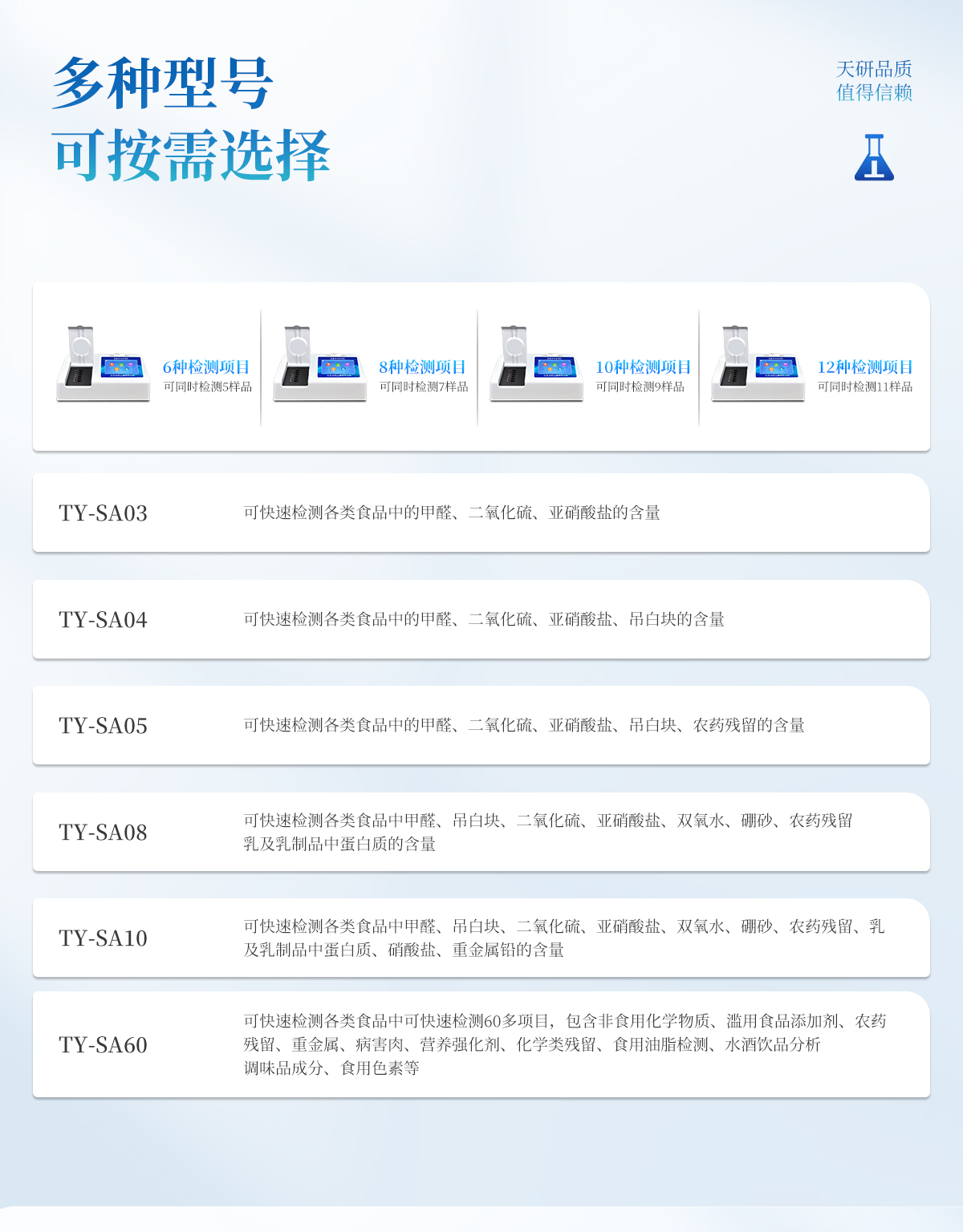 可快速檢測各類食品中的甲醛、二氧化硫、亞硝酸鹽、吊白塊的含量,儀器預留其他項目檢測程序和端口,根據日后需求可方便的自主增加檢測項目。