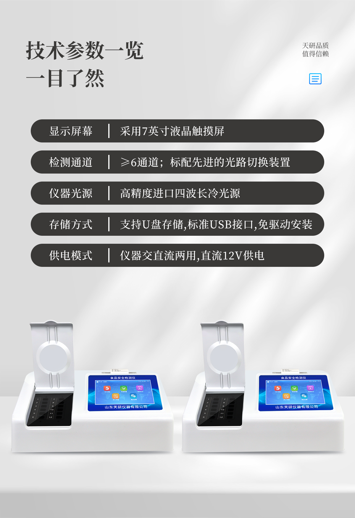 產(chǎn)品描述:產(chǎn)品介紹:多功能食品安全檢測儀可快速檢測200多項目,包含非食用化學(xué)物質(zhì)、濫用食品添加劑、農(nóng)藥殘留、獸藥殘留、重金屬、病害肉、營養(yǎng)強化劑、抗生素類殘留、激素類殘留、真菌毒素類殘留、化學(xué)類殘留等現(xiàn)場的定性定量檢測。該多功能食品安全檢測儀為集成化食品安全快速檢測分析設(shè)備,廣泛應(yīng)用于市場監(jiān)管局、檢測中心、衛(wèi)生【詳情】