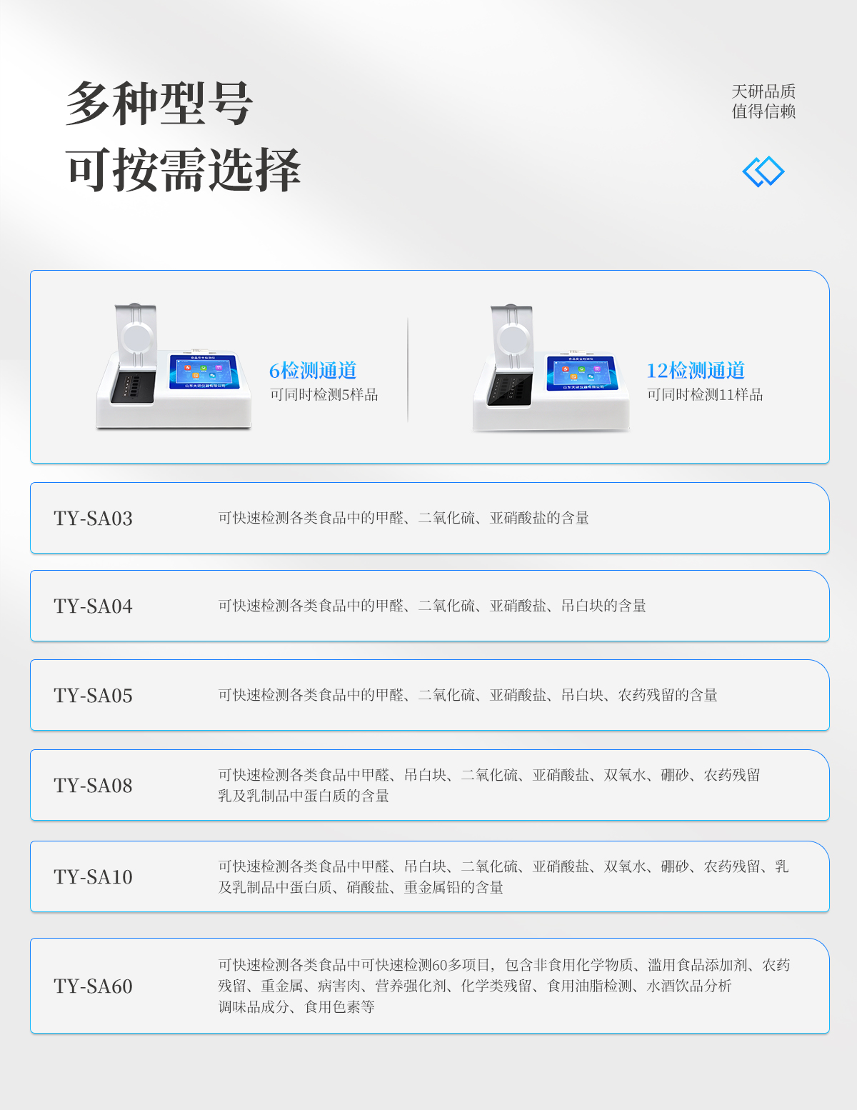 可快速檢測各類食品中的甲醛、二氧化硫、亞硝酸鹽、吊白塊的含量,儀器預(yù)留其他項目檢測程序和端口,根據(jù)日后需求可方便的自主增加檢測項目。