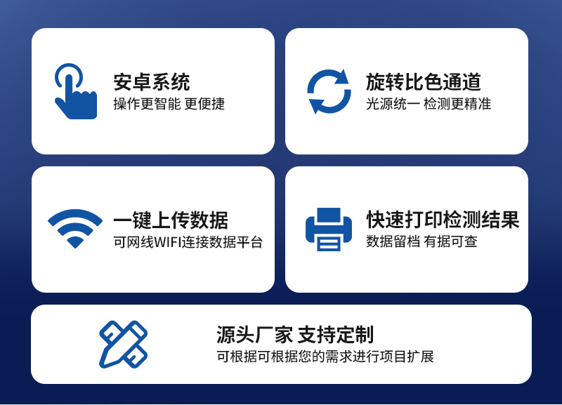 | 安卓智能操作系統(tǒng),采用更加**和人性化操作,儀器具有無線聯(lián)網(wǎng)上傳功能,快速上傳數(shù)據(jù),進(jìn)行數(shù)據(jù)統(tǒng)計(jì)和分析。 | 智能化程度高,儀器具有自檢功能:具有開機(jī)自檢和調(diào)零功能,具有自動(dòng)檢測(cè)重復(fù)性功能;同時(shí),檢測(cè)完成可自動(dòng)打印檢測(cè)報(bào)告和二維碼。手機(jī)掃碼可顯示出詳細(xì)檢測(cè)信息。 | 儀器帶有監(jiān)管平臺(tái),數(shù)據(jù)可局域網(wǎng)和互聯(lián)網(wǎng)數(shù)據(jù)上傳,檢測(cè)結(jié)果直接傳至食品安全監(jiān)管平臺(tái)。進(jìn)行區(qū)域食品安全監(jiān)管及大數(shù)據(jù)分析處理與數(shù)據(jù)統(tǒng)計(jì),檢測(cè)區(qū)域食品安全長短期動(dòng)態(tài),達(dá)到食品安全問題預(yù)估、預(yù)警 。 | 樣品處理簡(jiǎn)單省力,整體操作快速、安全、便捷。 | 儀器具有自身保護(hù)功能,可設(shè)置用戶名及密碼,防止非工作人員操作等。 | 內(nèi)置強(qiáng)大的數(shù)據(jù)庫,可在儀器上直接選擇樣品名稱、檢測(cè)指標(biāo)、送檢單位等信息,也可在儀器上直接編輯錄入樣品名稱、檢測(cè)指標(biāo)、送檢單位等信息并保存進(jìn)樣品數(shù)據(jù)庫,方便后期操作調(diào)取使用。 | 儀器具有重新校準(zhǔn)、鎖定、恢復(fù)出廠設(shè)置功能。 |