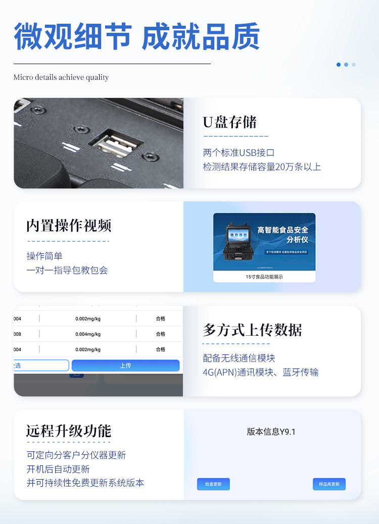 | 儀器采用手提一體化系統(tǒng)檢測技術,將分光光度模塊、膠體金檢測模塊、新型農殘檢測模塊、數字化管理模塊、無線通訊模塊高度集成于一體,支持檢測200種食品安全檢測項目,同時預留升級檢測方法。 | 儀器檢測模塊標準化、智能化,檢測項目可隨意自由組合。檢測箱體內置多個標準檢測單元,檢測模塊可以調整配置。 | 顯示屏幕:儀器采用10.1英寸豎向液晶觸摸屏顯,搭配運行安卓智能操作系統(tǒng),主控芯片采用ARM Cortex-A7,RK3288/4核處理器,主頻1.88Ghz,操作方便,性能更強。 | 檢測通道:≥12通道;采用精密旋轉比色池設計,使用同芯片同光源校準精度,解決不同光源之間的誤差值,更加準確**。(1-12通道間誤差0.1%,**號:ZL202022821055.2) | 儀器光源:高精度進口四波長冷光源,每個通道均配置 410、520、590、630nm 波長光源,標配**的光路切換裝置,**光路切換功能可實現64波長,并且所有檢測項目可實現所有通道同時檢測。 | 設備可一鍵校準,自動保存校準數據,自動對比校驗,得到精準光源,采用Android SP存儲數據,光源數據永不丟失,方便每一次使用。 | 通訊接口:配備無線通信模塊、4G(APN)通訊模塊、藍牙傳輸,同時具有雙USB接口以及RJ45網線接口,可以多方式實現數據保存及數據傳輸。 | 存儲方式:支持U盤存儲,標準USB接口,免驅動安裝。檢測結果存儲容量20萬條以上,可生成Excel表格進行拷貝,并具有登錄保護功能。 | 智能化操作系統(tǒng):: ★操作系統(tǒng):儀器可在同一檢測界面自動對應相關檢測通道,一次性選擇1-12個樣品名稱,無需退出界面,節(jié)省操作時間。并可以對每個通道屬性和樣品信息單獨進行編輯,例如送檢單位、人員,檢測人員等,打印時勾選打印顯示。 | ★數據集成系統(tǒng):設備首頁自動匯總分析檢測數據,包含:周檢測數據、月檢測數據,全部檢測總數量,均包含檢測總數,合格數,不合格數,以及相關柱形分析圖,各項檢測數據一目了然,無需電腦查詢,更加快捷直觀。 | ★數據庫系統(tǒng):十幾項數據庫分類管理儀器:包含項目類型、項目數據、檢測數據、歷史記錄、國標信息、曲線信息、采樣信息、檢測信息、受檢信息、復核信息、圖表信息、光源校準信息、打印樣式信息、樣品庫信息等等,數據庫之間互相協調聯動保證數據的真實完整性。同時產品數據庫以及歷史檢測記錄支持一鍵檢索功能。 | ★限量規(guī)判系統(tǒng):具有限量查詢、添加物質合規(guī)判定系統(tǒng)。檢測出結果后,系統(tǒng)自動調用系統(tǒng)數據庫中相關國標進行比對判定,客觀顯示判定結果是否合格 | ★項目預設系統(tǒng):儀器具有任務預設模塊,一鍵提前預設,給出方便快捷的新檢測方案,每一個任務分別可以設置不同的樣品、批次、編號、來源、備注、抽樣信息、檢測信息、受檢信息、復核信息等更多信息。樣品送檢時一鍵調取保存信息,并可多次調取,大大提高檢測效率。 | ★數據監(jiān)管系統(tǒng):同步對接監(jiān)管平臺,數據可局域網和互聯網數據上傳,檢測結果可選擇直接傳至食品安全監(jiān)管平臺。進行區(qū)域食品安全監(jiān)管及大數據分析處理與數據統(tǒng)計,檢測區(qū)域食品安全長短期動態(tài),達到食品安全問題預估、預警。 | ★打印系統(tǒng):內置全新打印機,新創(chuàng)自定義打印方式,可按需靈活勾選控制:產品合格證(國家農業(yè)部標準要求),二維碼,抽樣信息、檢測信息,受檢信息、復核信息、抽樣日期、檢測日期等信息的打印。 | 供電模式:儀器交直流兩用,直流12V供電,可連接車載電源,可配6ah大容量充電鋰電池,電量可實時顯示,方便戶外流動測試。 | 膠體金檢測模塊:采用雙通道CMOS成像處理技術及膠體金免疫層析技術,可同時讀取雙膠體金卡數據,自動采集、處理分析,將檢測結果顯示,并可根據參考限值自動判斷檢測結果,可檢測常見的獸藥殘留、生物毒素、抗生素、違禁添加物等。 | ★探測技術:CMOS成像探測; | ★檢測通道:1個通道; | ★檢測方式:消線法和比色法; | ★顯示模式:陰性或陽性; | 曲線形式:軌道式掃描方式,顯示金標卡圖像,實時生成、識別CT曲線圖,無需手動調整,完成檢測后自動退出檢測卡。兼容市場上其他金標卡,使用耗材不受限制。 | 儀器具備遠程升級功能,可定向分客戶分儀器更新,開機后自動更新,并可持續(xù)性免費更新系統(tǒng)版本,無需像傳統(tǒng)產品返廠更新,節(jié)省時間及人力成本并避免了物流運輸返廠升級導致設備損壞的潛在風險。 |