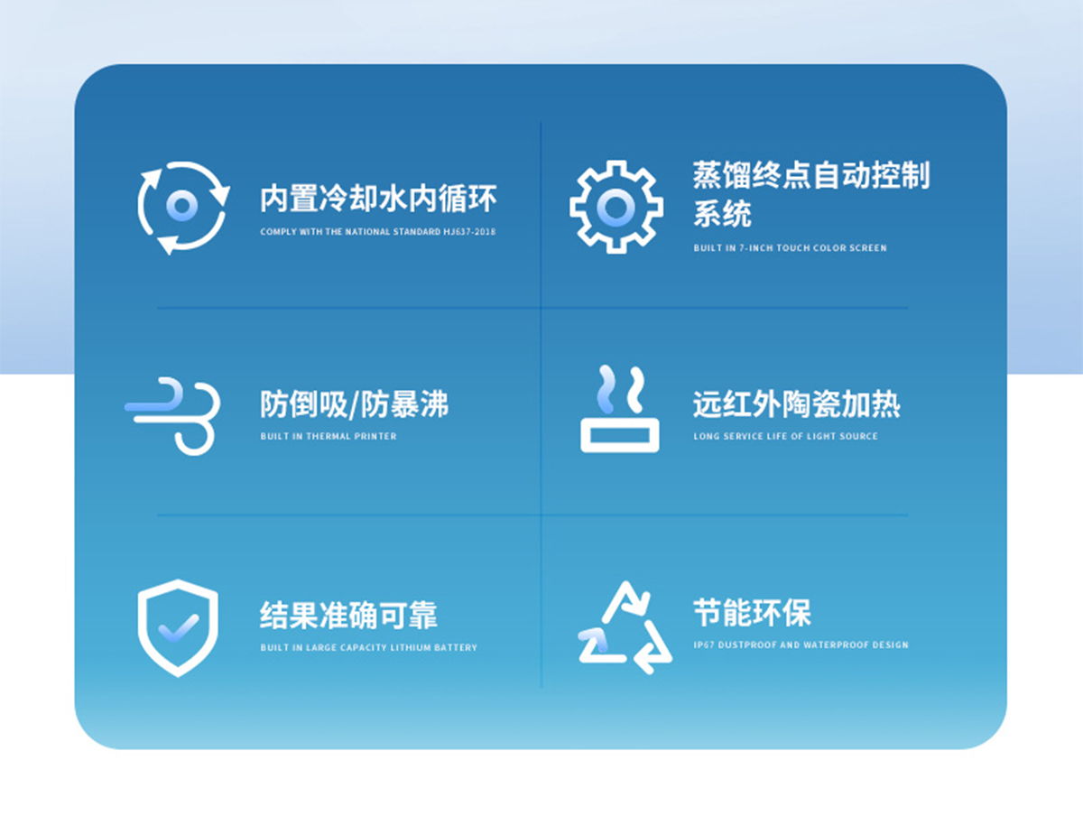 該儀器實(shí)驗(yàn)了控溫、自動(dòng)防倒吸、加熱均勻、防止暴沸、智能終點(diǎn)控制等功能。使用方便,節(jié)能環(huán)保。經(jīng)過實(shí)驗(yàn)室蒸餾回收率比對(duì)驗(yàn)證,結(jié)果準(zhǔn)確,回收率達(dá)95%以上。該儀器可廣泛適用于環(huán)保、疾控、水產(chǎn)、供排水、高校、科研院所、廠礦企業(yè)等各類化學(xué)實(shí)驗(yàn)室需要蒸餾處理的場(chǎng)所,如揮發(fā)酚、氨氮、凱氏氮油中水分等項(xiàng)目的蒸餾處理。