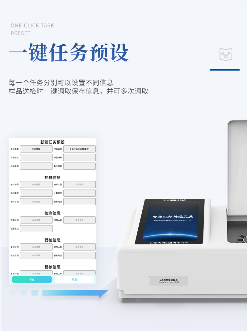 | 儀器采用臺(tái)式一體化系統(tǒng)檢測(cè)技術(shù),將分光光度模塊、數(shù)字化管理模塊、無(wú)線通訊模塊高度集成于一體,可支持檢測(cè)60種食品安全檢測(cè)項(xiàng)目,同時(shí)預(yù)留升級(jí)檢測(cè)方法。 | 儀器檢測(cè)模塊標(biāo)準(zhǔn)化、智能化,檢測(cè)項(xiàng)目可隨意自由組合。檢測(cè)箱體內(nèi)置多個(gè)標(biāo)準(zhǔn)檢測(cè)單元,檢測(cè)模塊可以調(diào)整配置。 | 顯示屏幕:儀器采用10.1英寸豎向液晶觸摸屏顯,搭配運(yùn)行安卓智能操作系統(tǒng),主控芯片采用ARM Cortex-A7,RK3288/4核處理器,主頻1.88Ghz,操作方便,性能更強(qiáng)。 | 檢測(cè)通道:≥12通道;采用精密旋轉(zhuǎn)比色池設(shè)計(jì),使用同芯片同光源校準(zhǔn)精度,解決不同光源之間的誤差值,更加準(zhǔn)確**。(1-12通道間誤差0.1%,**號(hào):ZL202022821055.2) | 儀器光源:高精度進(jìn)口四波長(zhǎng)冷光源,每個(gè)通道均配置 410、520、590、630nm 波長(zhǎng)光源,標(biāo)配**的光路切換裝置,**光路切換功能可實(shí)現(xiàn)64波長(zhǎng),并且所有檢測(cè)項(xiàng)目可實(shí)現(xiàn)所有通道同時(shí)檢測(cè)。 | 設(shè)備可一鍵校準(zhǔn),自動(dòng)保存校準(zhǔn)數(shù)據(jù),自動(dòng)對(duì)比校驗(yàn),得到精準(zhǔn)光源,采用Android SP存儲(chǔ)數(shù)據(jù),光源數(shù)據(jù)永不丟失,方便每一次使用。 | 通訊接口:配備無(wú)線通信模塊、4G(APN)通訊模塊、藍(lán)牙傳輸,同時(shí)具有雙USB接口以及RJ45網(wǎng)線接口,可以多方式實(shí)現(xiàn)數(shù)據(jù)保存及數(shù)據(jù)傳輸。 | 存儲(chǔ)方式:支持U盤存儲(chǔ),標(biāo)準(zhǔn)USB接口,免驅(qū)動(dòng)安裝。檢測(cè)結(jié)果存儲(chǔ)容量20萬(wàn)條以上,可生成Excel表格進(jìn)行拷貝,并具有登錄保護(hù)功能。 | 智能化操作系統(tǒng): | 1、操作系統(tǒng):儀器可在同一檢測(cè)界面自動(dòng)對(duì)應(yīng)相關(guān)檢測(cè)通道,一次性選擇1-12個(gè)樣品名稱,無(wú)需退出界面,節(jié)省操作時(shí)間。并可以對(duì)每個(gè)通道屬性和樣品信息單獨(dú)進(jìn)行編輯,例如送檢單位、人員,檢測(cè)人員等,打印時(shí)勾選打印顯示。 | 2、數(shù)據(jù)集成系統(tǒng):設(shè)備首頁(yè)自動(dòng)匯總分析檢測(cè)數(shù)據(jù),包含:周檢測(cè)數(shù)據(jù)、月檢測(cè)數(shù)據(jù),全部檢測(cè)總數(shù)量,均包含檢測(cè)總數(shù),合格數(shù),不合格數(shù),以及相關(guān)柱形分析圖,各項(xiàng)檢測(cè)數(shù)據(jù)一目了然,無(wú)需電腦查詢,更加快捷直觀。 | 3、數(shù)據(jù)庫(kù)系統(tǒng):十幾項(xiàng)數(shù)據(jù)庫(kù)分類管理儀器:包含項(xiàng)目類型、項(xiàng)目數(shù)據(jù)、檢測(cè)數(shù)據(jù)、歷史記錄、國(guó)標(biāo)信息、曲線信息、采樣信息、檢測(cè)信息、受檢信息、復(fù)核信息、圖表信息、光源校準(zhǔn)信息、打印樣式信息、樣品庫(kù)信息等等,數(shù)據(jù)庫(kù)之間互相協(xié)調(diào)聯(lián)動(dòng)保證數(shù)據(jù)的真實(shí)完整性。同時(shí)產(chǎn)品數(shù)據(jù)庫(kù)以及歷史檢測(cè)記錄支持一鍵檢索功能。 | 4、限量規(guī)判系統(tǒng):具有限量查詢、添加物質(zhì)合規(guī)判定系統(tǒng)。檢測(cè)出結(jié)果后,系統(tǒng)自動(dòng)調(diào)用系統(tǒng)數(shù)據(jù)庫(kù)中相關(guān)國(guó)標(biāo)進(jìn)行比對(duì)判定,客觀顯示判定結(jié)果是否合格。 | 5、項(xiàng)目預(yù)設(shè)系統(tǒng):儀器具有任務(wù)預(yù)設(shè)模塊,一鍵提前預(yù)設(shè),給出方便快捷的新檢測(cè)方案,每一個(gè)任務(wù)分別可以設(shè)置不同的樣品、批次、編號(hào)、來(lái)源、備注、抽樣信息、檢測(cè)信息、受檢信息、復(fù)核信息等更多信息。樣品送檢時(shí)一鍵調(diào)取保存信息,并可多次調(diào)取,大大提高檢測(cè)效率。 | 6、數(shù)據(jù)監(jiān)管系統(tǒng):同步對(duì)接監(jiān)管平臺(tái),數(shù)據(jù)可局域網(wǎng)和互聯(lián)網(wǎng)數(shù)據(jù)上傳,檢測(cè)結(jié)果可選擇直接傳至食品安全監(jiān)管平臺(tái)。進(jìn)行區(qū)域食品安全監(jiān)管及大數(shù)據(jù)分析處理與數(shù)據(jù)統(tǒng)計(jì),檢測(cè)區(qū)域食品安全長(zhǎng)短期動(dòng)態(tài),達(dá)到食品安全問(wèn)題預(yù)估、預(yù)警。 | 7.1、全新打印系統(tǒng):內(nèi)置全新打印機(jī),新創(chuàng)自定義打印方式,可按需靈活勾選控制:二維碼,抽樣信息、檢測(cè)信息,受檢信息、復(fù)核信息、抽樣日期、檢測(cè)日期等信息的打印。 | 7.2、A4紙版本報(bào)告打印功能(可選配):設(shè)備擁有兩種結(jié)果展示方式,可以自動(dòng)生成A4打印模板和小票打印模板兩種樣式,可通過(guò)WiFi及網(wǎng)線等方式鏈接外置打印機(jī)可進(jìn)行打印。 | 8.供電模式:儀器交直流兩用,直流12V供電,可連接車載電源,可配6ah大容量充電鋰電池,電量可實(shí)時(shí)顯示,方便戶外流動(dòng)測(cè)試。 | 9.儀器具備遠(yuǎn)程升級(jí)功能,可定向分客戶分儀器更新,開(kāi)機(jī)后自動(dòng)更新,并可持續(xù)性免費(fèi)更新系統(tǒng)版本,無(wú)需像傳統(tǒng)產(chǎn)品返廠更新,節(jié)省時(shí)間及人力成本并避免了物流運(yùn)輸返廠升級(jí)導(dǎo)致設(shè)備損壞的潛在風(fēng)險(xiǎn)。 |