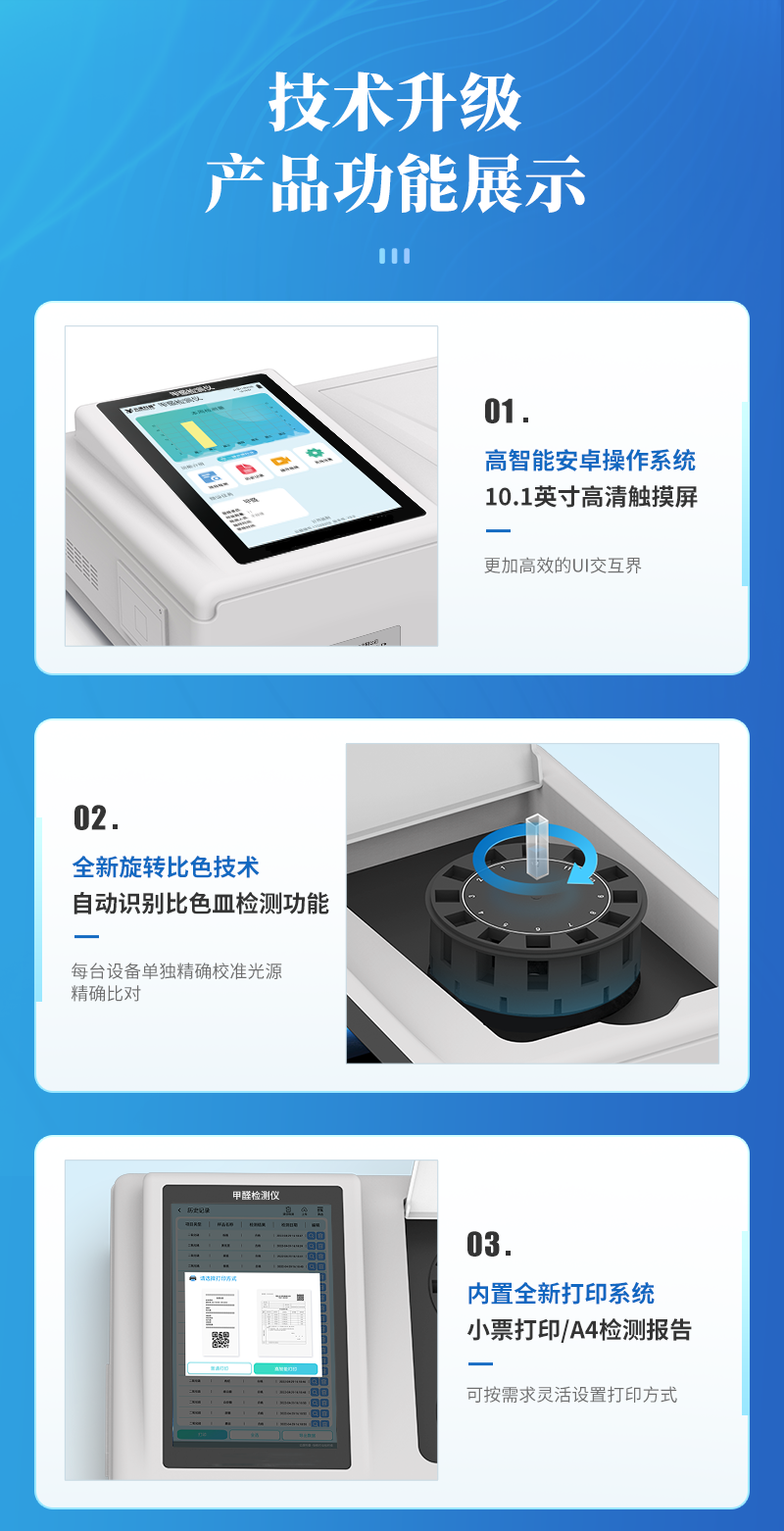 | 儀器采用臺式一體化系統(tǒng)檢測技術,將分光光度模塊、新型農殘檢測模塊、數字化管理模塊、無線通訊模塊高度集成于一體,支持檢測200種食品安全檢測項目,同時預留升級檢測方法。 | 儀器檢測模塊標準化、智能化,可隨意自由組合。檢測箱體內置多個標準檢測單元,檢測模塊可以調整配置。 | 儀器采用全新安卓智能系統(tǒng),主控芯片采用 ARM Cortex-A7,RK3288/4核處理器,10.1寸高清液晶觸摸豎屏,更加**的UI交互界面,運轉快捷;儀器配備無線通信模塊: 4G(APN)通訊模塊、Wifi模塊,藍牙傳輸,同時具有雙USB接口以及RJ45接口能以多種方式實現(xiàn)數據保存和數據傳輸功能。 | 創(chuàng)新檢測模式: | ★檢測通道:≥12通道;采用精密旋轉比色池設計,使用同芯片同光源校準精度,解決不同光源之間的誤差值。1-12通道間誤差0.1%。(**號:ZL202022821055.2) | ★儀器具有自動識別比色皿檢測功能,即:將樣品比色皿放入儀器后,點擊樣品檢測,儀器自動識別比色皿進行通道檢測。 | 進口高精光源: | 高精度進口四波長冷光源,通道配置 410、520、590、630nm 波長光源,一個光源芯片驅動一個光源,誤差極小,每臺設備單獨**校準光源,**比對,同時參照四種不同波段光源全方位覆蓋市面上99%的農殘食品項目檢測。 | 智能化操作系統(tǒng): | 便捷操作系統(tǒng):設備檢測時可在同一檢測界面自動對應相關檢測通道一次性選擇1-12個樣品名稱,無須退出界面,節(jié)省操作時間。 | 數據集成系統(tǒng):設備首頁自動統(tǒng)計檢測數據包含:周檢測數據、月檢測數據,全部檢測總數量,均包含檢測總數,合格數,不合格數,以及相關柱形分析圖,對各項檢測數據清晰掌握,無需電腦查詢,更加快捷直觀。 | 項目預設系統(tǒng):支持添加單個及多個相同或不相同的任務預設,一鍵快速調取,每一個任務分別可以設置不同的樣品、批次、編號、來源、備注、抽樣信息、檢測信息、受檢信息、復核信息等更多信息。無縫鏈接平臺和APP實時查看下發(fā)任務。 | 數據監(jiān)管系統(tǒng):同步對接監(jiān)管平臺,數據可局域網和互聯(lián)網數據上傳,檢測結果可選擇直接傳至食品安全監(jiān)管平臺。集成OSS輸出存儲服務、區(qū)分設備定向管理應用,進行區(qū)域食品安全監(jiān)管及大數據分析處理與數據統(tǒng)計,檢測區(qū)域食品安全長短期動態(tài),達到食品安全問題預估、預警。 | 自定義打印系統(tǒng):內置全新打印系統(tǒng),新創(chuàng)自定義打印方式,可按需靈活設置開啟或關閉:產品合格證(國家農業(yè)部標準要求),二維碼,抽樣信息、檢測信息,受檢信息、復核信息、抽樣日期、檢測日期等信息的打印。 | 系統(tǒng)遠程更新功能:可定向分客戶分儀器更新系統(tǒng),按照不同客戶后期實際需求添加項目,無需機器返廠,即可遠程實時升級全新系統(tǒng),節(jié)省時間成本及避免運輸造成設備損壞。 | 儀器主機采用一體化防水、抗壓、防撞擊、防腐蝕箱體設計,同時配備交直流供電,可連接車載電源,可選配大容量充電鋰電池,滿足現(xiàn)場野外檢測需求。 | 安全證書,放心保障:儀器具有中國計量科學研究院校準證書,**認證。 |