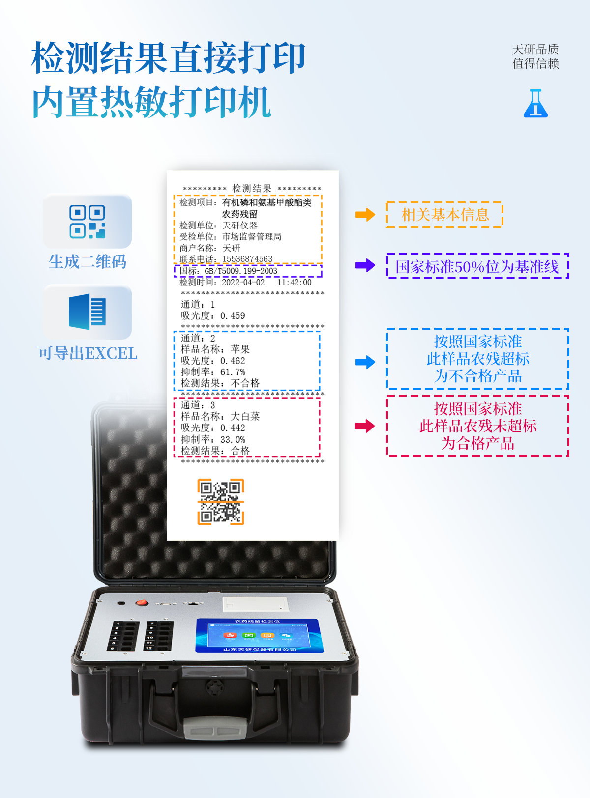 | 機箱采用工業(yè)級ABS工程塑料箱,方便攜帶,穩(wěn)固耐用,便于流動測試。 | 智能操作系統(tǒng),采用更加人性化操作,主控采用多核處理器,主頻1.88Ghz,運轉(zhuǎn)速度更快速,穩(wěn)定性更強。 | 自動判斷樣品是否合格,檢測結(jié)果更加直觀。 | 儀器具有100多種蔬菜名稱菜單庫,分類管理,并可按需添加或刪除蔬菜名,編輯蔬菜名稱,可直接打印出蔬菜名稱。 | 檢測通道:6個檢測通道,可以同時測試多個樣品,循環(huán)檢測,即放即檢,每個樣品由程序控制分別獨立工作,不會互相干擾。 | 儀器具有wifi聯(lián)網(wǎng)功能,可將數(shù)據(jù)快速上傳電腦,進(jìn)行數(shù)據(jù)管理與統(tǒng)計,4G信號GPRS遠(yuǎn)傳功能,可插手機卡實現(xiàn)數(shù)據(jù)遠(yuǎn)傳平臺,。 | 顯示方式:7英寸高靈敏真彩觸摸屏顯示,人性化中文操作界面,讀數(shù)直觀、簡單。 | 打印機采用串口5v打印,可選擇手動打印或者自動打印,三分鐘出打印結(jié)果,打印格式為檢測人姓名、吸光度差值、檢測時間、檢測機構(gòu)、樣品名稱及結(jié)果判定。 | 光源采用進(jìn)口超高亮發(fā)光二極管,具有低功耗、高精度、穩(wěn)定性強、光源可控可以關(guān)掉不使用的光源,響應(yīng)速度快等優(yōu)點。 | 智能恒流穩(wěn)壓,光強自動校準(zhǔn),長時間連續(xù)工作光源無溫漂現(xiàn)象。 | 采用USB2.0接口設(shè)計,方便數(shù)據(jù)的存貯和移動,并可隨時與計算機直接相連,并且可用計算機控制儀器。實現(xiàn)數(shù)據(jù)查詢、瀏覽、分析、統(tǒng)計、打印等。 | 智能化程度高,儀器具有自檢功能:具有開機自檢和調(diào)零功能,具有自動檢測重復(fù)性功能 | 儀器具有自身保護(hù)功能,可設(shè)置用戶名及密碼,防止非工作人員操作等。 | 采用DC12v直流供電,安全系統(tǒng)更高,并且配備6A鋰電池充電器。 | 儀器具有重新校準(zhǔn)、鎖定、恢復(fù)出廠設(shè)置功能。 |