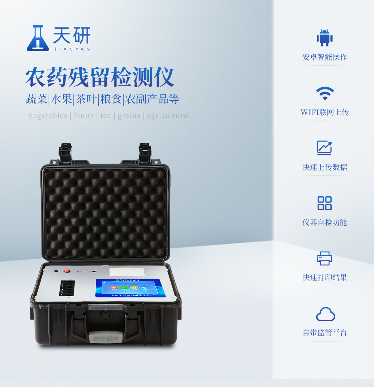 | 機箱采用工業(yè)級ABS工程塑料箱,方便攜帶,穩(wěn)固耐用,便于流動測試。 | 智能操作系統(tǒng),采用更加人性化操作,主控采用多核處理器,主頻1.88Ghz,運轉(zhuǎn)速度更快速,穩(wěn)定性更強。 | 自動判斷樣品是否合格,檢測結(jié)果更加直觀。 | 儀器具有100多種蔬菜名稱菜單庫,分類管理,并可按需添加或刪除蔬菜名,編輯蔬菜名稱,可直接打印出蔬菜名稱。 | 檢測通道:12個檢測通道,可以同時測試多個樣品,循環(huán)檢測,即放即檢,每個樣品由程序控制分別獨立工作,不會互相干擾。 | 儀器具有wifi聯(lián)網(wǎng)功能,可將數(shù)據(jù)快速上傳電腦,進行數(shù)據(jù)管理與統(tǒng)計,4G信號GPRS遠(yuǎn)傳功能,可插手機卡實現(xiàn)數(shù)據(jù)遠(yuǎn)傳平臺,。 | 顯示方式:7英寸高靈敏真彩觸摸屏顯示,人性化中文操作界面,讀數(shù)直觀、簡單。 | 打印機采用串口5v打印,可選擇手動打印或者自動打印,三分鐘出打印結(jié)果,打印格式為檢測人姓名、吸光度差值、檢測時間、檢測機構(gòu)、樣品名稱及結(jié)果判定。 | 光源采用進口超高亮發(fā)光二極管,具有低功耗、高精度、穩(wěn)定性強、光源可控可以關(guān)掉不使用的光源,響應(yīng)速度快等優(yōu)點。 | 智能恒流穩(wěn)壓,光強自動校準(zhǔn),長時間連續(xù)工作光源無溫漂現(xiàn)象。 | 采用USB2.0接口設(shè)計,方便數(shù)據(jù)的存貯和移動,并可隨時與計算機直接相連,并且可用計算機控制儀器。實現(xiàn)數(shù)據(jù)查詢、瀏覽、分析、統(tǒng)計、打印等。 | 智能化程度高,儀器具有自檢功能:具有開機自檢和調(diào)零功能,具有自動檢測重復(fù)性功能 | 儀器具有自身保護功能,可設(shè)置用戶名及密碼,防止非工作人員操作等。 | 采用DC12v直流供電,安全系統(tǒng)更高,并且配備6A鋰電池充電器。 | 儀器具有重新校準(zhǔn)、鎖定、恢復(fù)出廠設(shè)置功能。 |