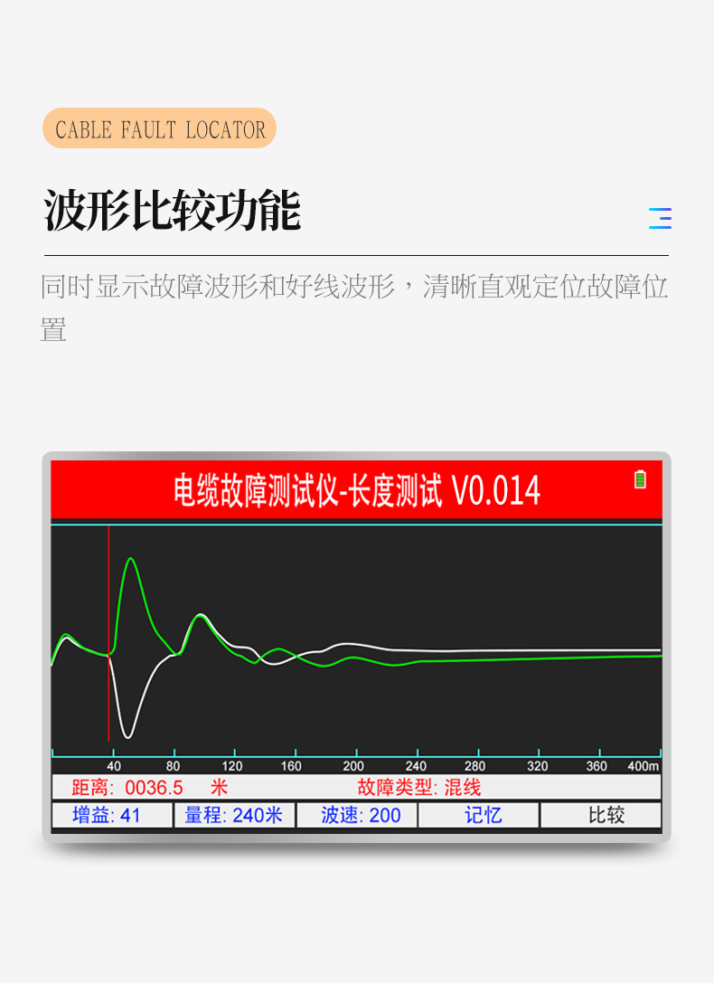 | 1.480*800大屏幕真彩手機細膩屏在陽光下也能清晰可辨。 | 2.自帶數(shù)據(jù)接口,支持客戶遠程升級。 | 3.采用ARM CPU配合FPGA技術(shù),可快速準確判斷故障波形。 | 4.波形比較功能,特別適用于線路某點氧化造成后端電壓 | 低故障的測試定位。 | 5.簡潔的對應(yīng)功能按鍵易學易會直觀方便。 | 6.高能量鋰電池,使用時間可達6-8小時。 | 7.信號器自帶萬用表功能方便測試電壓電阻及絕緣。 |