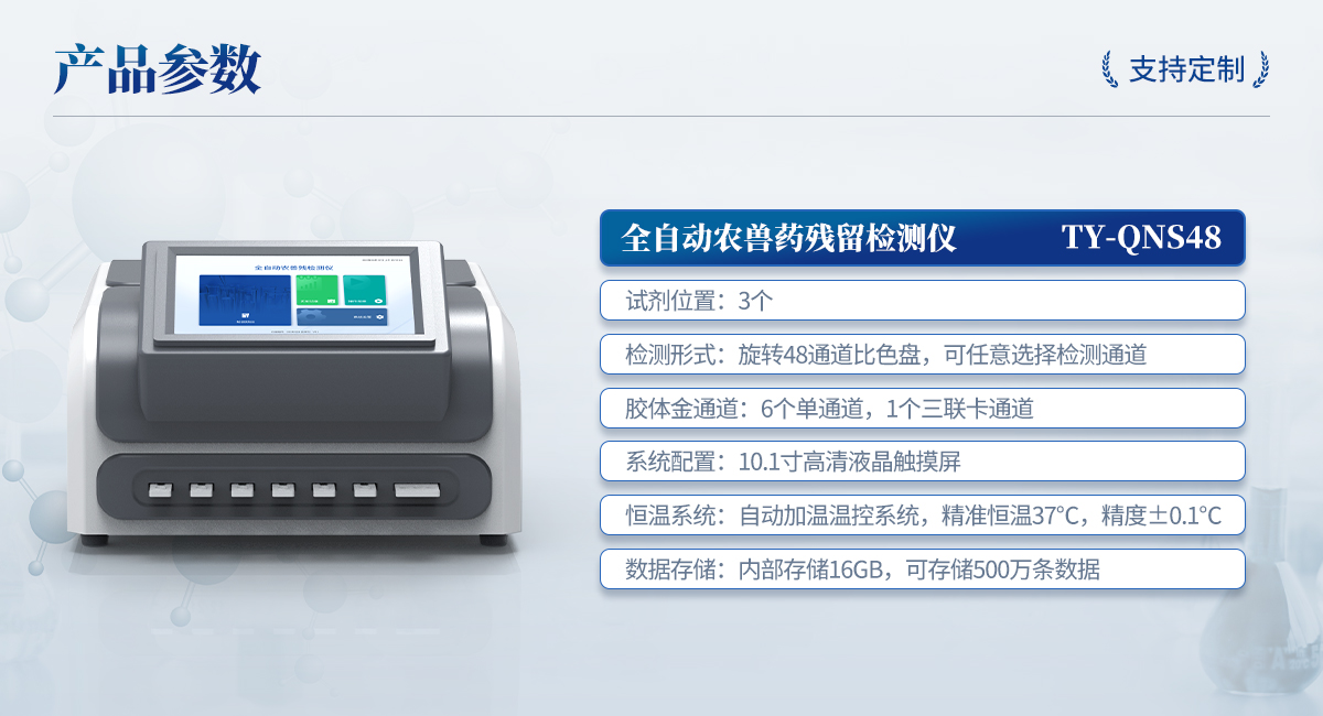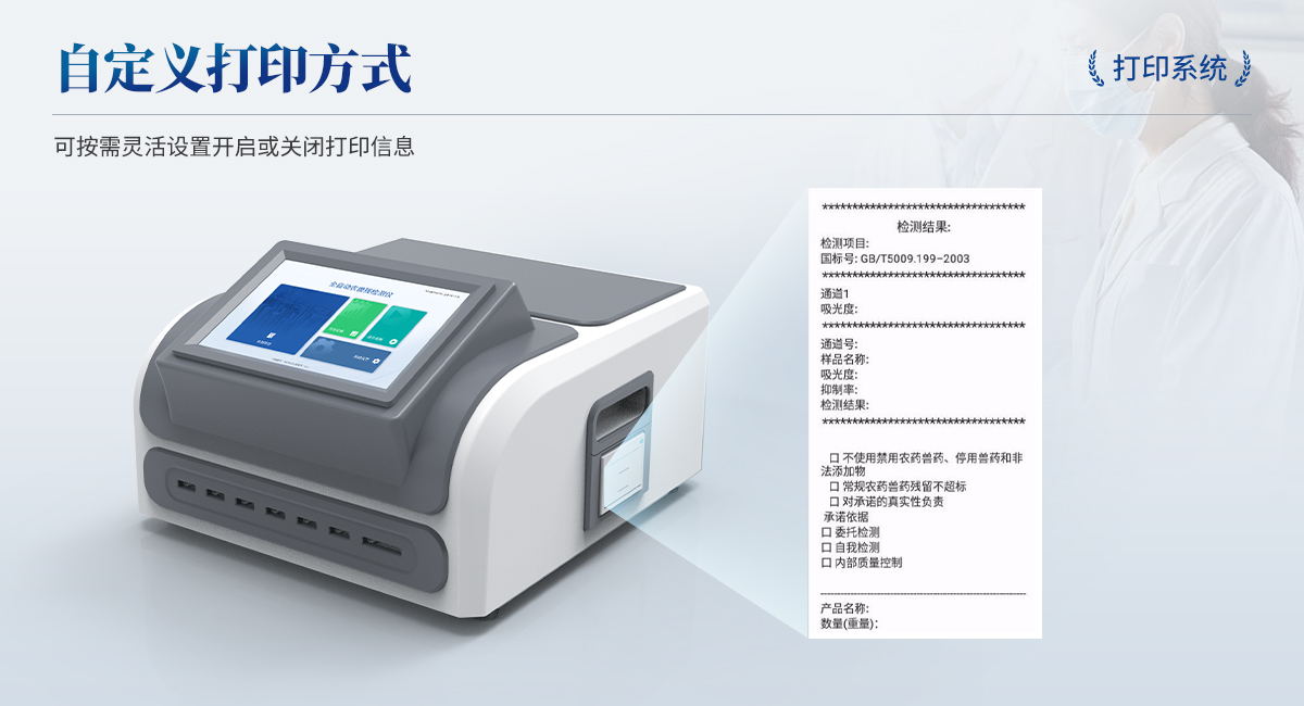 | 1. 試劑位置:3個(gè) | 2. 農(nóng)殘檢測盤:旋轉(zhuǎn)48通道比色盤,可任意選擇檢測通道,自動對應(yīng)選擇通道。 | 3. 膠體金通道:6個(gè)單通道,1個(gè)三聯(lián)卡通道,可讀取檢測卡結(jié)果,自動采集、處理分析,自動判斷檢測結(jié)果,并具備自動判空功能。 | 4.系統(tǒng)配置:10.1寸高清液晶觸摸屏,采用ARM Cortex-A7,RK3288/4核處理器,運(yùn)行內(nèi)存1GB。Android7.1.1 系統(tǒng)分辨率1280×800。 | 5.恒溫系統(tǒng):具有自動加溫溫控系統(tǒng),精準(zhǔn)恒溫37℃,精度±0.1℃。 | 6.添加系統(tǒng):儀器按照試劑要求自動、按時(shí)、按量加入試劑,并且自動對未正常放置的樣本或異常的樣本進(jìn)行檢查并提示。 | 7.清洗功能:儀器具備回流及自動清洗管路功能,避免試劑污染。 | 8.混勻功能:設(shè)備具備自動混勻功能。 | 9.光源校準(zhǔn):設(shè)備可自動校準(zhǔn),確保檢測準(zhǔn)確度。 | 10.實(shí)時(shí)監(jiān)控:儀器測試過程中屏幕顯示運(yùn)行狀態(tài),可實(shí)時(shí)查看。 | 11.數(shù)據(jù)存儲:內(nèi)部存儲16GB,可存儲500萬條數(shù)據(jù)。 | 12.樣品多選功能:設(shè)備具備樣品一鍵多選功能,選擇樣品自動匹配檢測通道。 | 13.項(xiàng)目預(yù)設(shè):可提前設(shè)置單個(gè)及多個(gè)相同或不相同的檢測任務(wù),可單次或者多次調(diào)取,減少檢測時(shí)間。 | 14.自定義打印系統(tǒng):內(nèi)置自定義打印系統(tǒng),可按需靈活設(shè)置開啟或關(guān)閉:產(chǎn)品合格證(國家農(nóng)業(yè)部標(biāo)準(zhǔn)),二維碼,抽樣信息、檢測信息,受檢信息等信息的打印。 | 15.A4版本報(bào)告打印功能:設(shè)備可自動生成A4版報(bào)告,A4報(bào)告帶二維碼,可掃描二維碼生成電子版,并可識別真?zhèn)巍?/td> | 16.傳輸方式:儀器配備無線通信模塊: 4G(APN)通訊模塊、Wifi模塊,藍(lán)牙傳輸模塊,同時(shí)具有USB接口以及RJ45接口能以多種方式實(shí)現(xiàn)數(shù)據(jù)保存和數(shù)據(jù)傳輸功能,設(shè)備數(shù)據(jù)可以同步上傳至平臺。 | 17.數(shù)據(jù)監(jiān)管系統(tǒng):設(shè)備自帶監(jiān)管平臺,并可同步對接監(jiān)管平臺,數(shù)據(jù)可局域網(wǎng)和互聯(lián)網(wǎng)數(shù)據(jù)上傳,檢測結(jié)果可直接傳至食品安全監(jiān)管平臺。達(dá)到食品安全問題預(yù)估、預(yù)警。 | 18.系統(tǒng)遠(yuǎn)程更新功能:無需設(shè)備返廠,即可遠(yuǎn)程實(shí)時(shí)升級全新系統(tǒng),節(jié)省時(shí)間成本及避免運(yùn)輸造成設(shè)備損。 |