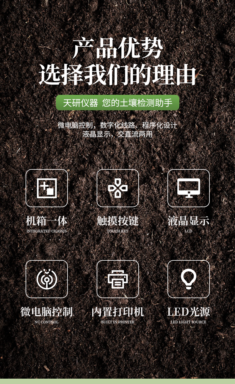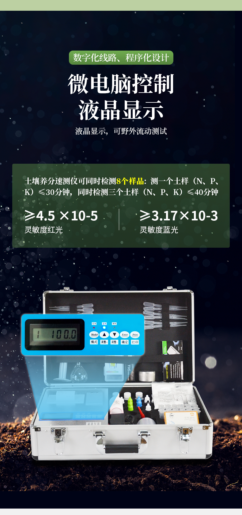 | 《機(jī)箱/藥劑一體式鋁合金機(jī)箱》設(shè)計(jì),便于攜帶、堅(jiān)固耐用,配套成品藥劑。 | 微電腦控制,數(shù)字化線路、程序化設(shè)計(jì),液晶顯示,交直流兩用,可野外流動(dòng)測(cè)試,大程度降低操作者的失誤和勞動(dòng)強(qiáng)度。 | 分辨率:0.001,觸摸式按鍵,內(nèi)置熱敏打印機(jī),可打印測(cè)試結(jié)果。 | 可檢測(cè)土壤及化肥、有機(jī)肥、植株中的速效氮、有效磷、速效鉀、全氮、全磷、全鉀、有機(jī)質(zhì)含量,土壤酸堿度,含鹽量(擴(kuò)展)。 | 土壤養(yǎng)分速測(cè)儀采用高亮度 LED 燈作為光源, 硅半導(dǎo)體作為信號(hào)接收系統(tǒng), 壽命長(zhǎng)達(dá)10萬小時(shí)級(jí)別。光源穩(wěn)定,一致性好。 | 比色槽部分采用單通道、雙光路設(shè)計(jì),無機(jī)械位移及磨損,光路測(cè)試定位**,保證測(cè)定結(jié)果精度。 |