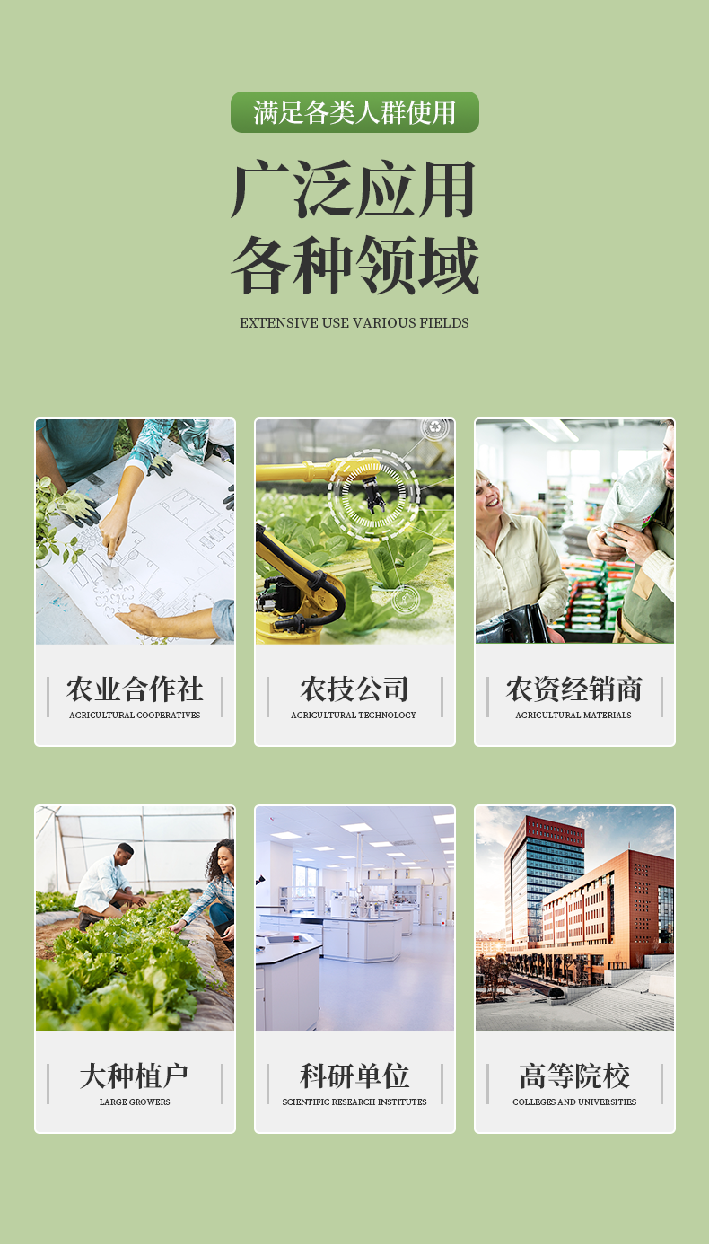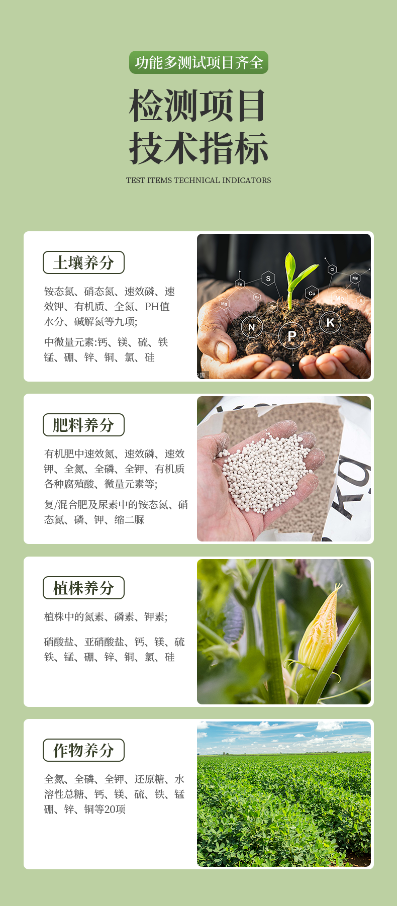 | 土壤養(yǎng)分:●銨態(tài)氮、硝態(tài)氮、速效磷、速效鉀、有機(jī)質(zhì)、全氮、堿解氮、pH值、含鹽量、水分等十項(xiàng); ● 中微量元素:鈣、鎂、硫、鐵、錳、硼、鋅、銅、氯、硅等。 | 肥料養(yǎng)分:● 單質(zhì)化肥中的氮、磷、鉀; ● 復(fù)(混)合肥及尿素中的銨態(tài)氮、硝態(tài)氮、磷、鉀、縮二脲; ● 有機(jī)肥中速效氮、速效磷、速效鉀、全氮、全磷、全鉀、有機(jī)質(zhì),各種腐植酸、微量元素(鈣、鎂、硫、鐵、錳、硼、鋅、銅、氯、硅)等。 | 植株養(yǎng)分:● 植株中的氮素、磷素、鉀素;硝酸鹽、亞硝酸鹽;鈣、鎂、硫、鐵、錳、硼、鋅、銅、氯、硅等項(xiàng)。 | 煙葉養(yǎng)分:全氮、全磷、全鉀、還原糖、水溶性總糖、硼、錳、鐵、銅、鈣、鎂等20項(xiàng)。 | 土壤、肥料重金屬:鉛、鉻、鎘、砷、汞、鎳、鋁、氟、鈦、硒等近十種重金屬。 | 食品(水果、蔬菜等):硝酸鹽、亞硝酸鹽、重金屬(鉛、鉻、鎘、砷、汞、鎳、鋁、氟、鈦、硒)等項(xiàng)。 | 水質(zhì):●銨態(tài)氮、硝酸鹽、亞硝酸鹽、磷、鉀、硬度、PH、鐵、銅、錳、鋅、硼、氯、硫、硅、鉬等。 |