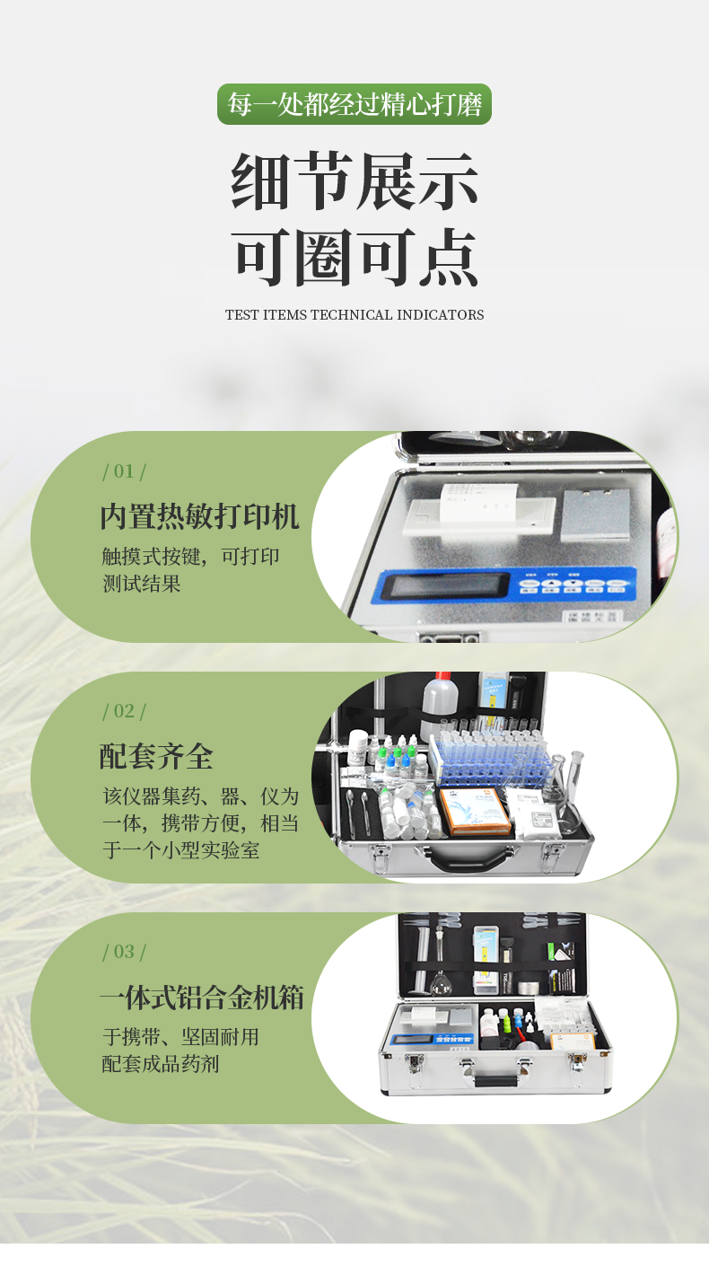 | 儀器整機(jī)質(zhì)保五年,終身免費(fèi)維修服務(wù),免費(fèi)郵寄儀器、免費(fèi)培訓(xùn)、免費(fèi)提供檢測試劑。 | 終身免費(fèi)提供土肥等農(nóng)業(yè)相關(guān)技術(shù)支持! | 配置清單(兩個(gè)鋁合金箱子): |