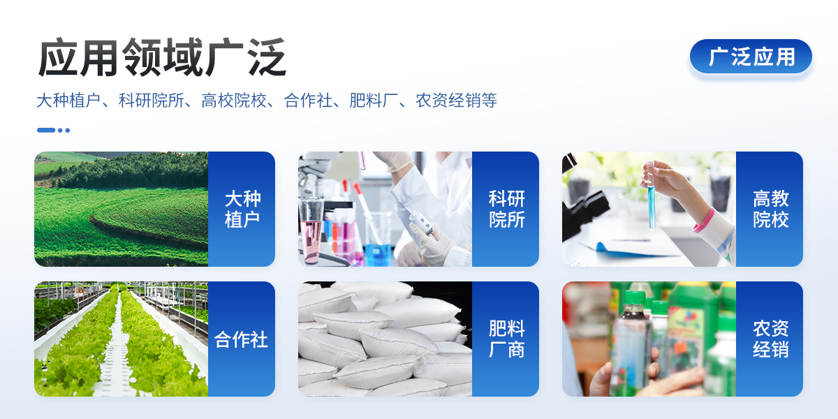 | 1、土壤養(yǎng)分: ●土壤總有機碳TOC、土壤碳氮比、銨態(tài)氮、土壤有效磷、土壤速效鉀、土壤硝態(tài)氮、土壤水解氮、土壤全氮、土壤全磷、土壤全鉀、土壤有機質(zhì)(丘林法)、土壤有機質(zhì)(浸提法)、PH值、含鹽量、水分。 ●土壤中微量元素:土壤鈣、土壤鎂、土壤硫、土壤硅、土壤硼、土壤鐵、土壤銅、土壤錳、土壤鋅、土壤氯; ●土壤重金屬:土壤鉛、土壤砷、土壤鎘、土壤鉻、土壤汞。 | 2、肥料養(yǎng)分: ●有機肥總有機碳TOC、有機肥碳氮比、全氮、有機肥全磷、有機肥全鉀、有機肥硝態(tài)氮、有機肥速效磷、有機肥速效鉀、有機肥酸解氮、有機質(zhì); ●復合肥碳氮比、全氮、復合肥全磷、復合肥全鉀; ●水溶肥碳氮比、全氮、水溶肥全磷、水溶肥全鉀; ●葉面肥碳氮比、全氮、葉面肥全磷、葉面肥全鉀; ●水溶性腐植酸(風化煤)、水溶性腐植酸(褐煤)、水溶性腐植酸(泥炭)、游離態(tài)腐植酸(風化煤)、游離態(tài)腐植酸(褐煤)、游離態(tài)腐植酸(泥炭); ●單質(zhì)肥:氮肥中銨態(tài)氮、肥料硝態(tài)氮、尿素氮、縮二脲、磷肥中磷、磷肥中水溶性磷、鉀肥中鉀; ●各種肥料微量元素:肥料鈣、肥料鎂、肥料硫、肥料硅、肥料硼、肥料鐵、肥料銅、肥料錳、肥料鋅、肥料氯; ●肥料重金屬:肥料鉛、肥料砷、肥料鎘、肥料鉻、肥料汞。 |