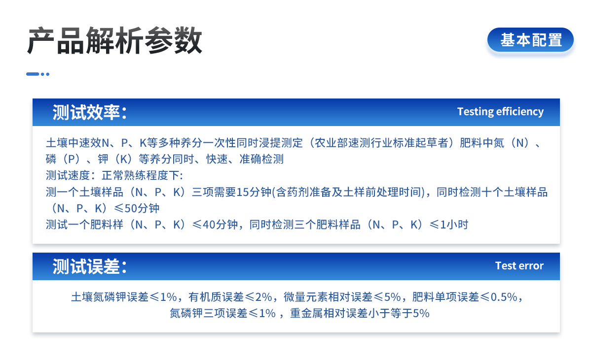 | 土壤氮磷鉀誤差≤1%,有機(jī)質(zhì)誤差≤2%,微量元素相對(duì)誤差≤5%;肥料單項(xiàng)誤差≤0.5%,氮磷鉀三項(xiàng)誤差≤1%。 |