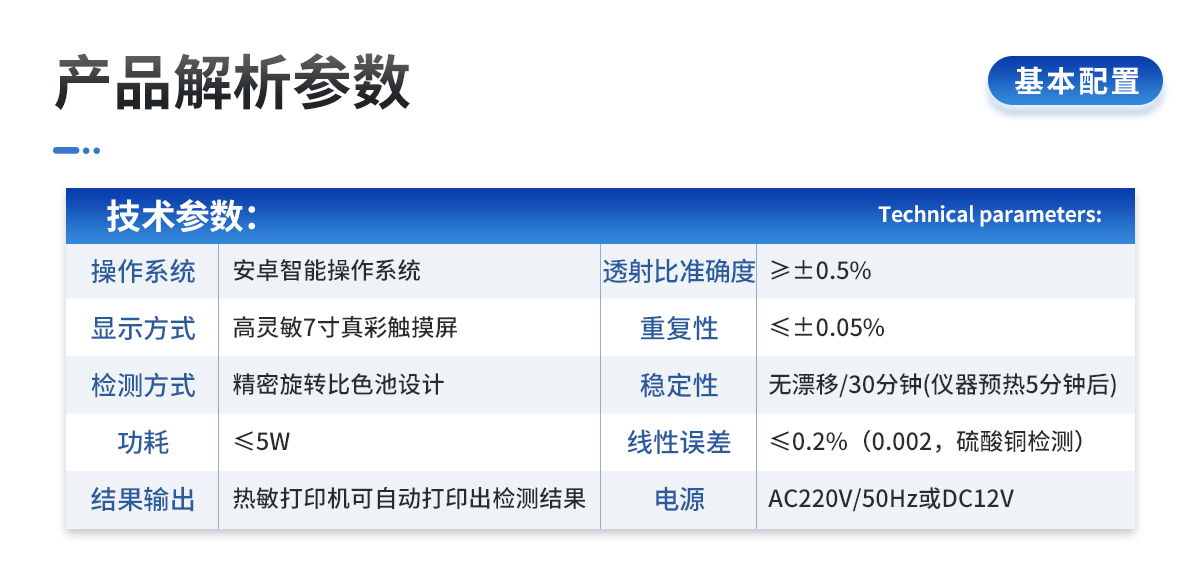 | 1.電源:交流 220±22V 直流 12V+5V(儀器內(nèi)置鋰電池也可用車載電源) | 2.功率: ≤5W | 3.量程及分辨率:0.001-9999 | 4.重復(fù)性誤差: ≤0.02%(0.0002,重鉻酸鉀溶液) | 5.儀器穩(wěn)定性:一個(gè)小時(shí)內(nèi)顯示數(shù)字無漂移(透光度測量);兩個(gè)小時(shí)內(nèi)數(shù)字漂移不超過0.3%(0.003,透光度測量)、0.001(吸光度測量)。 | 6.線性誤差: ≤0.1%(0.001,硫酸銅檢測) | 7.靈敏度:紅光≥4.5 ×10-5 藍(lán)光≥3.17×10-3 綠光≥2.35×10-3 橙光≥2.13×10-3 | 8.波長范圍 :紅光:680±2nm; 藍(lán)光:420±2nm; 綠光:510±2nm;橙光:590±4nm | 9.顯示屏分辨率:1024*600 | 10.抗震等級(jí):IP65 | 11、儀器尺寸:48×34.5×22cm | 12、主機(jī)凈重:5.2kg |