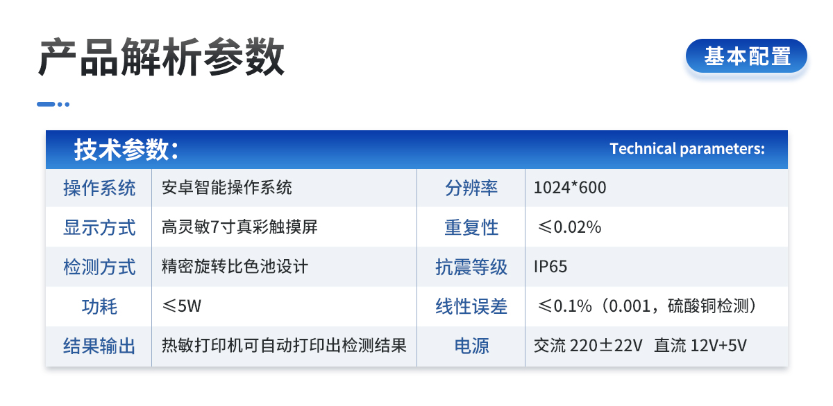 | 電源:交流 220±22V 直流 12V+5V(儀器內(nèi)置鋰電池也可用車載電源) | 功率: ≤5W | 量程及分辨率:0.001-9999 | 重復(fù)性誤差: ≤0.02%(0.0002,重鉻酸鉀溶液) | 儀器穩(wěn)定性:一個(gè)小時(shí)內(nèi)顯示數(shù)字無漂移(透光度測(cè)量);兩個(gè)小時(shí)內(nèi)數(shù)字漂移不超過0.3%(0.003,透光度測(cè)量)、0.001(吸光度測(cè)量)。 | 線性誤差: ≤0.1%(0.001,硫酸銅檢測(cè)) | 靈敏度:紅光≥4.5 ×10-5 藍(lán)光≥3.17×10-3 綠光≥2.35×10-3 橙光≥2.13×10-3 | 波長(zhǎng)范圍 :紅光:680±2nm; 藍(lán)光:420±2nm; 綠光:510±2nm;橙光:590±4nm | PH值(酸堿度): (1)測(cè)試范圍:1~14 (2)精度:0.01 (3)誤差:±0.1 | 含鹽量:(1)測(cè)試范圍:0.01%~1.00% (2)相對(duì)誤差:±5% | 土壤水分技術(shù)參數(shù)水分單位:﹪(g/100g);含水率測(cè)試范圍:0-100﹪;誤差小于0.5% | 土壤溫度:范圍:-40-120℃;測(cè)量精度:±0.2℃;分辨率:±0.1℃ | 土壤電導(dǎo):范圍:0-20ms;測(cè)量精度:±2%;分辨率:±0..1ms | 溫度量程:-40℃~+125℃ ;精度:±0.3℃ | 濕度量程:0%HR-100%HR ;精度:±3%HR | 露點(diǎn)量程:-20~+50℃ ;精度:±0.5℃ | 氣壓量程:300~110kPa(海拔9000米~-500米);精度:0.06hPa(0.5米) | 光照量程:0-200000Lux ;精度:0.054Lux | CO2量程:0-5000PPM ;精度:50PPM | 抗震等級(jí):IP65 | 儀器尺寸:48×34.5×22cm | 主機(jī)凈重:5.2kg |