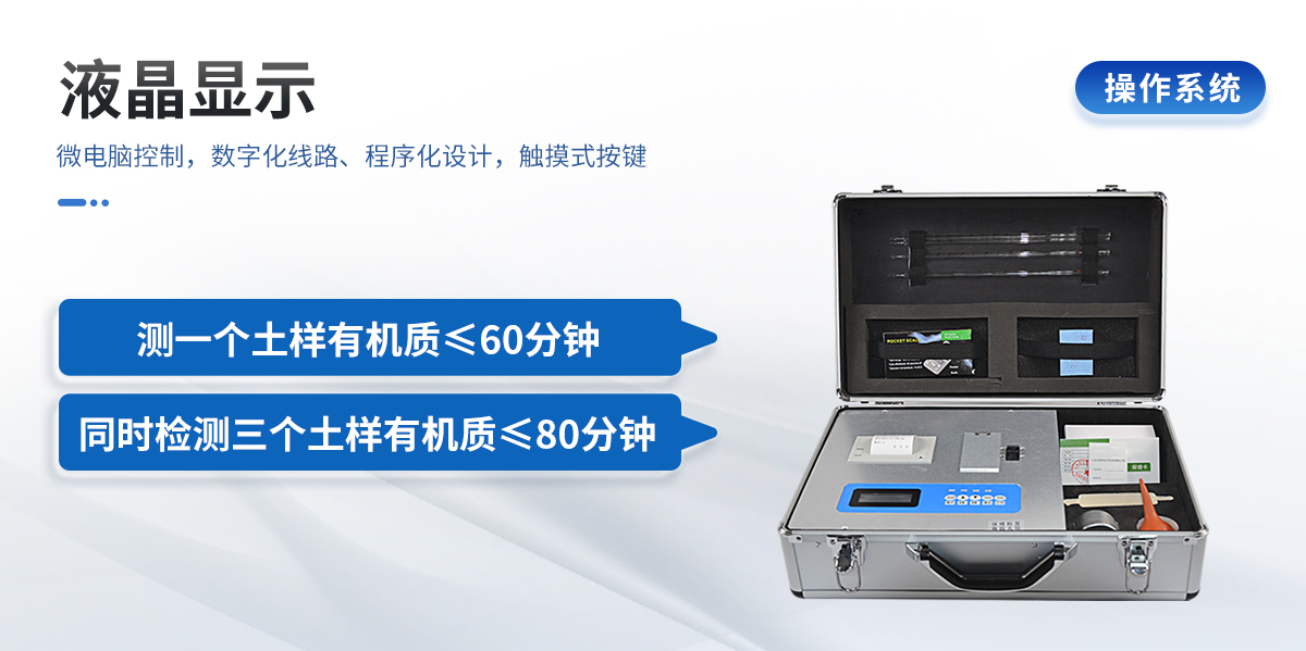 | 配套齊全:土壤有機(jī)質(zhì)速測儀該儀器集藥、器、儀為一體,攜帶方便,相當(dāng)于一個(gè)小型實(shí)驗(yàn)室。適于農(nóng)業(yè)服務(wù)部門或農(nóng)資經(jīng)銷商、肥料廠商測土施肥和鑒別肥料真假。 | 操作簡便、速度快捷,成品藥劑開瓶即用,無須配置。 | 性能可靠:工作穩(wěn)定性優(yōu)于國家標(biāo)準(zhǔn)JJG179-90指標(biāo)的6倍,重復(fù)性達(dá)到光柵型分光光度計(jì)指標(biāo)水平。 |