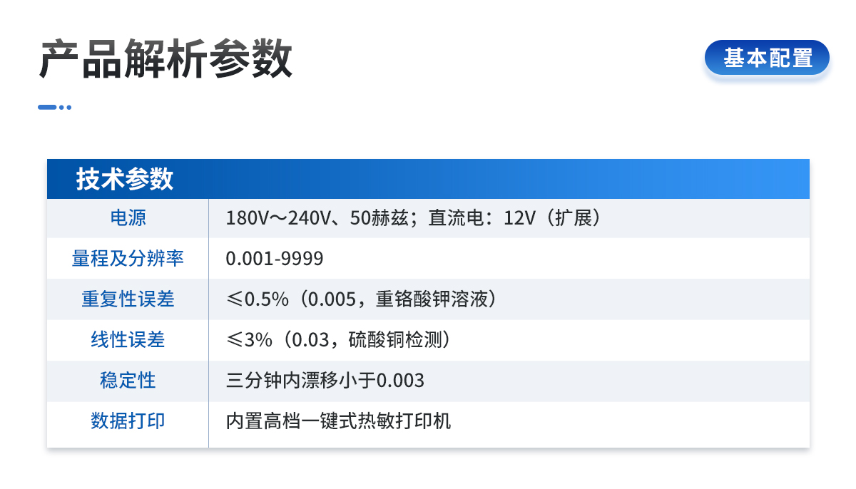 | 電源:交流電:180V~240V、50赫茲;直流電:12V(擴(kuò)展) | 量程及分辨率:0.001-9999 | 穩(wěn)定性:三分鐘內(nèi)漂移小于0.003 | 線性誤差:≤3%(0.03,硫酸銅檢測) | 重復(fù)性誤差:≤0.5%(0.005,重鉻酸鉀溶液) | 靈敏度:紅光≥4.5 ×10-5 藍(lán)光≥3.17×10-3 | 波長范圍:紅光620±8nm 藍(lán)光440±8nm | 測試速度:測一個(gè)土樣有機(jī)質(zhì)≤60分鐘(含前處理時(shí)間) | 可同時(shí)檢測8個(gè)土樣≤個(gè)小時(shí)(含前處理時(shí)間) | 數(shù)據(jù)打?。簝?nèi)置高檔一鍵式熱敏打印機(jī)(國內(nèi)首家**設(shè)計(jì)) |