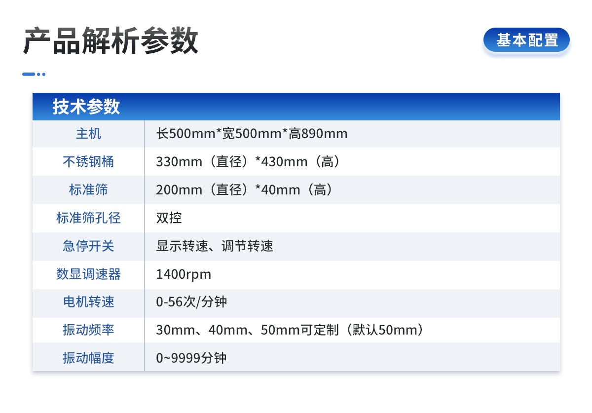 | 1、主機:長500mm*寬500mm*高890mm | 2、水桶:200mm(直徑)*400mm(高) | 3、標準篩:100mm(直徑)*40mm(高) | 4、標準篩孔徑:5mm,3mm,2mm,1mm,0.5mm,0.25mm。(可選配其他規(guī)格孔徑) | 5、急停開關(guān):雙控 | 6、數(shù)顯調(diào)速器:顯示轉(zhuǎn)速、調(diào)節(jié)轉(zhuǎn)速 | 7、電機轉(zhuǎn)速:1400 rpm | 8、振動頻率:0-56次/分鐘 | 9、振動幅度:30mm、40mm、50mm可定制(默認50mm) | 10、計時:數(shù)顯計時器 | 11、定時范圍:0~9999分鐘 | 12、電源:220V 50Hz 120W | 13、漏電保護器:10A |