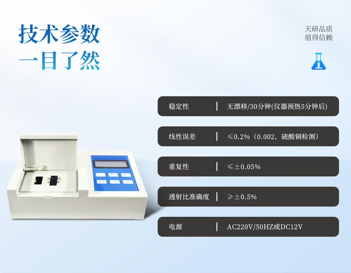 | 儀器透射比準確度 ≥±0.5% | 儀器重復性 ≤±0.05% | 儀器穩(wěn)定性 無漂移/30分鐘(儀器預熱5分鐘后) | 線性誤差 ≤0.2%(0.002,硫酸銅檢測) | 儀器功耗 ≤5W | 電源 AC220V/50Hz或DC12V | 結果輸出 內置**熱敏打印機可自動打印出檢測結果,方便直觀。 |