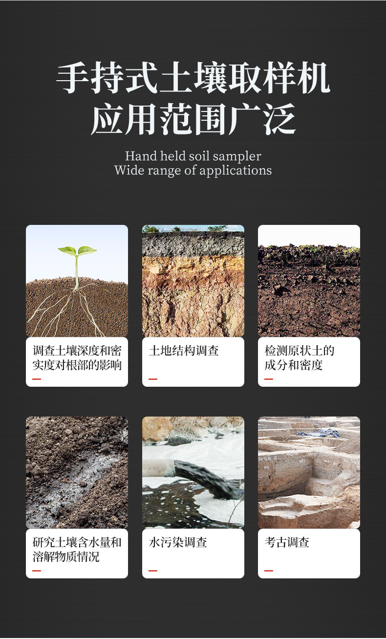 | 旋轉(zhuǎn)式,上下沒(méi)有擾動(dòng),不會(huì)破壞土壤剖面結(jié)構(gòu) | 采樣量大,插銷(xiāo)連接,易于拆卸。 | 鉆頭帶有鋸齒,通過(guò)沖擊錘鉆入土壤,入土容易。 | 筒型鉆頭獨(dú)特可拆卸裁口設(shè)計(jì),取樣容易。 | 樣品處于比較寬松的柱狀圓筒中,取出十分容易 | 狀土壤很難被壓縮(保持原狀) | 采集一個(gè)樣本就可以研究整個(gè)土壤剖面情況 | 比開(kāi)挖一個(gè)采樣坑要節(jié)約時(shí)間和減少樣本破壞 | 可有效地用于所有類(lèi)型的土壤 |