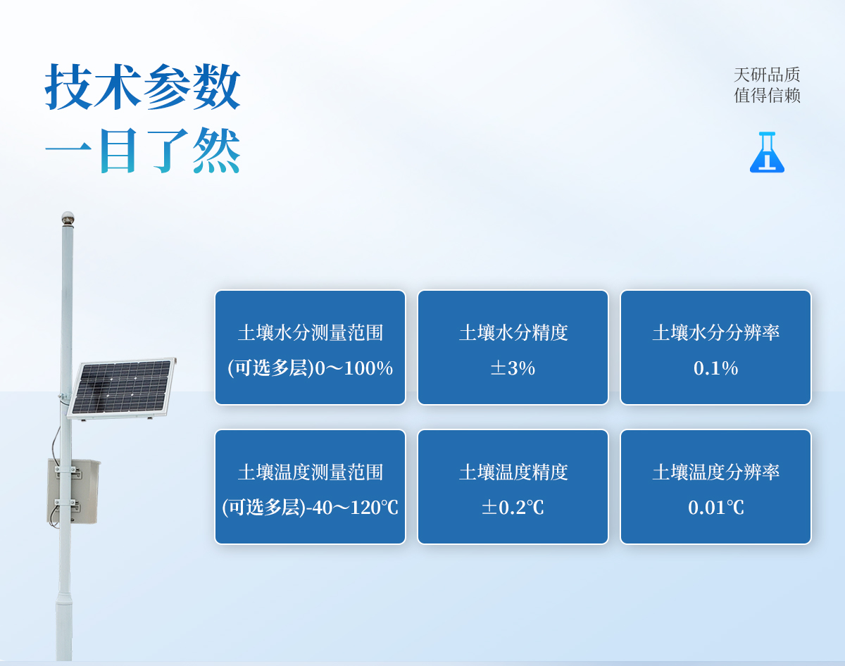 | 主控制器技術(shù)參數(shù) 數(shù)據(jù)存儲(chǔ)空間:≥100000條 記錄間隔:1分-24小時(shí)可調(diào) 數(shù)據(jù)傳輸:無(wú)線傳輸 工作環(huán)境:-30℃~80℃ 供電方式:220v市電、太陽(yáng)能供電系統(tǒng)同時(shí)使用 | 傳感器技術(shù)參數(shù) 空氣濕度:0~100% 精度:±3% 分辨率:0.1% 光照 :-20~80℃ 精度:±2% 雨量 :-20~80℃ 承雨口徑:φ200mm 精度:±2% 分辨率:0.2mm 土壤水分:測(cè)量精度:±3% 工作溫度范圍:-20℃~50℃ 土壤ec:測(cè)量精度:±4% 土壤EC測(cè)量范圍:0.2~12mS/cm 土壤溫度:精度:±0.2℃ 測(cè)量范圍:-40℃~120℃ |