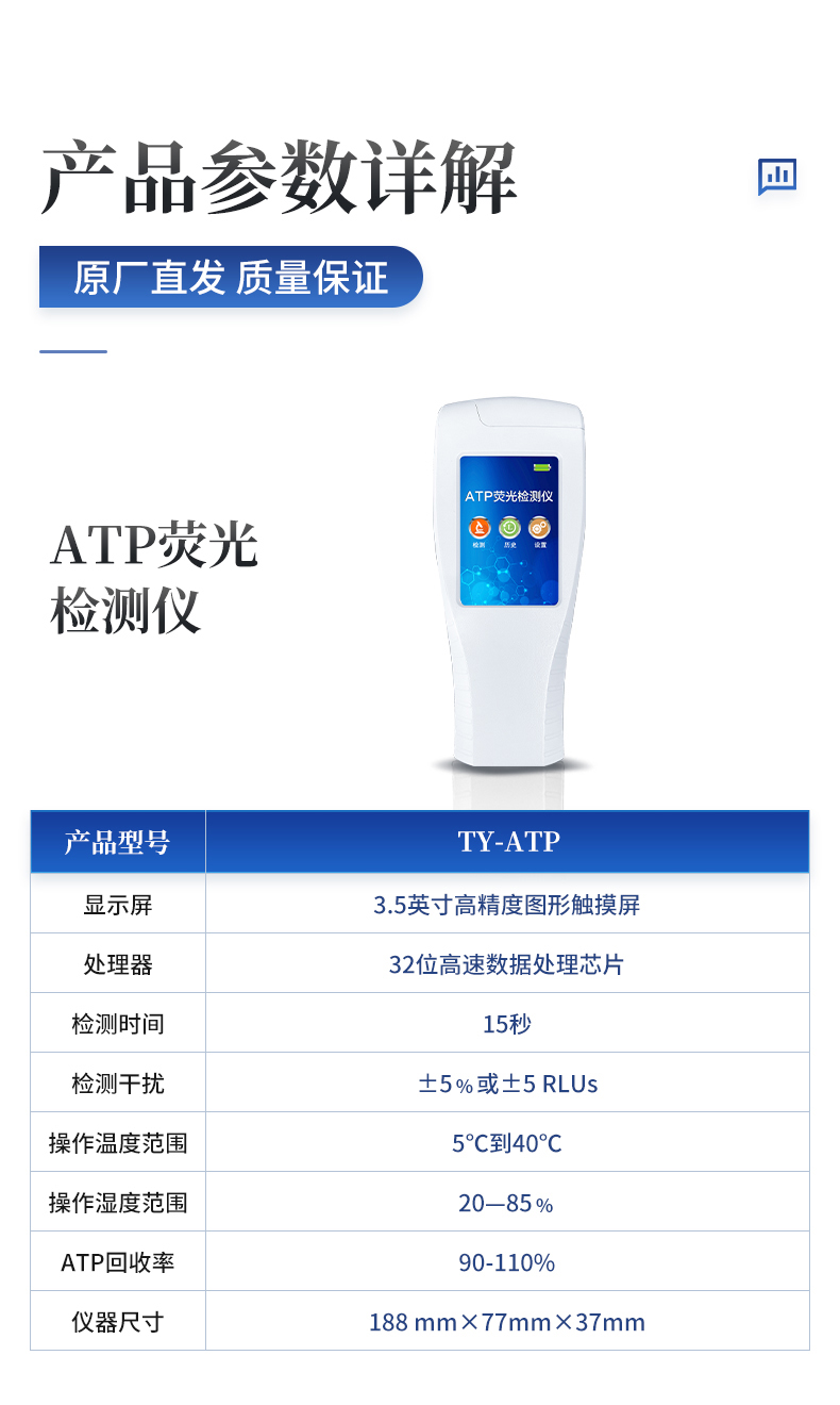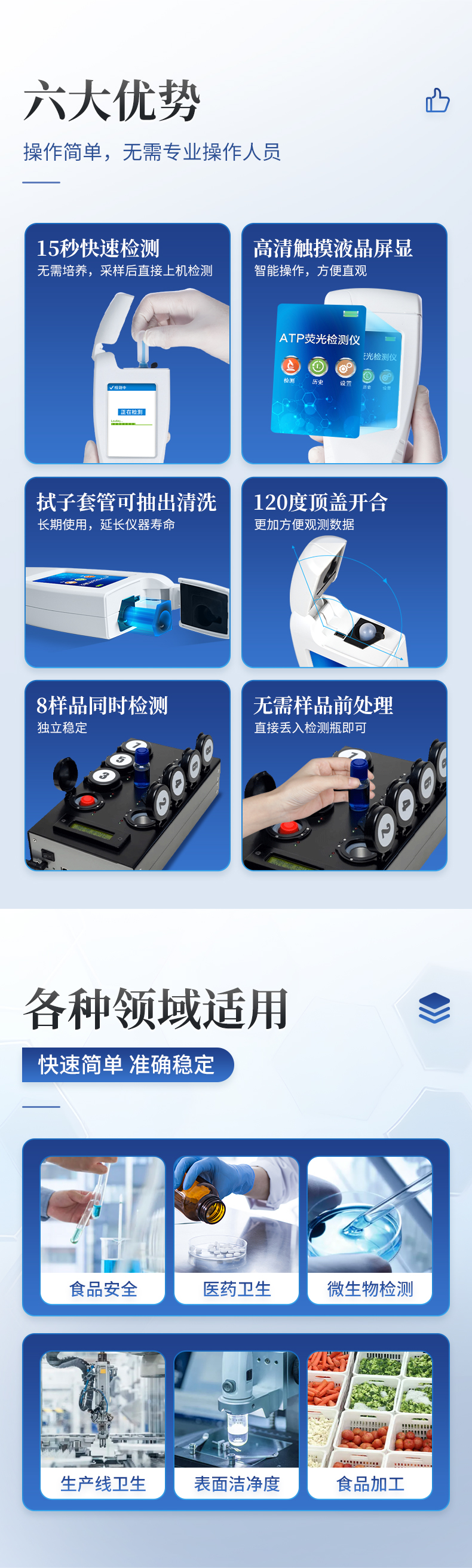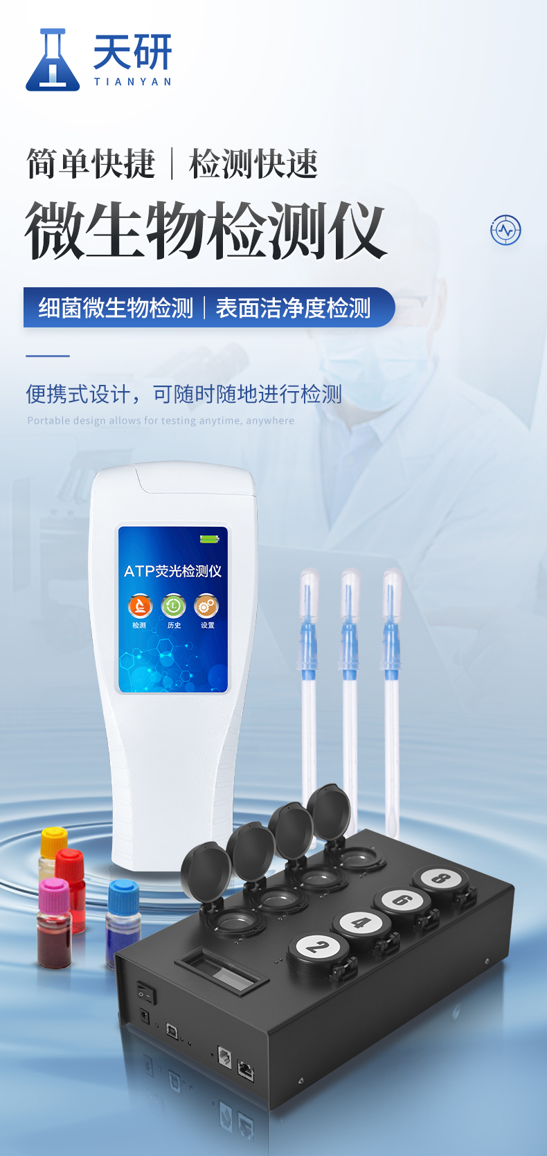 該設(shè)備為全新升級(jí)產(chǎn)品,大屏幕觸摸顯示屏,代替?zhèn)鹘y(tǒng)按鍵。操作采用生物化學(xué)反應(yīng)方法檢測(cè)ATP含量,ATP熒光檢測(cè)儀基于螢火蟲發(fā)光原理,利用“熒光素酶—熒光素體系”快速檢測(cè)三磷酸腺苷(ATP)。ATP拭子含有可以裂解細(xì)胞膜的試劑,能將細(xì)胞內(nèi)ATP釋放出來,與試劑中含有的特異性酶發(fā)生反應(yīng),產(chǎn)生光,再用熒光照度計(jì)檢測(cè)發(fā)光值,微生物的數(shù)量與發(fā)光值成正比,由于所有生物活細(xì)胞中含有恒量的ATP,所以ATP含量可以清晰地表明樣品中微生物與其他生物殘余的多少,用于判斷衛(wèi)生狀況。